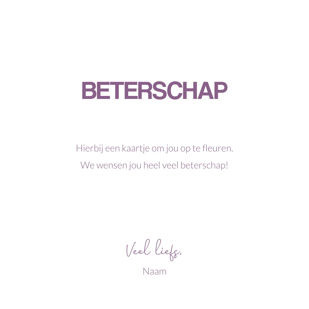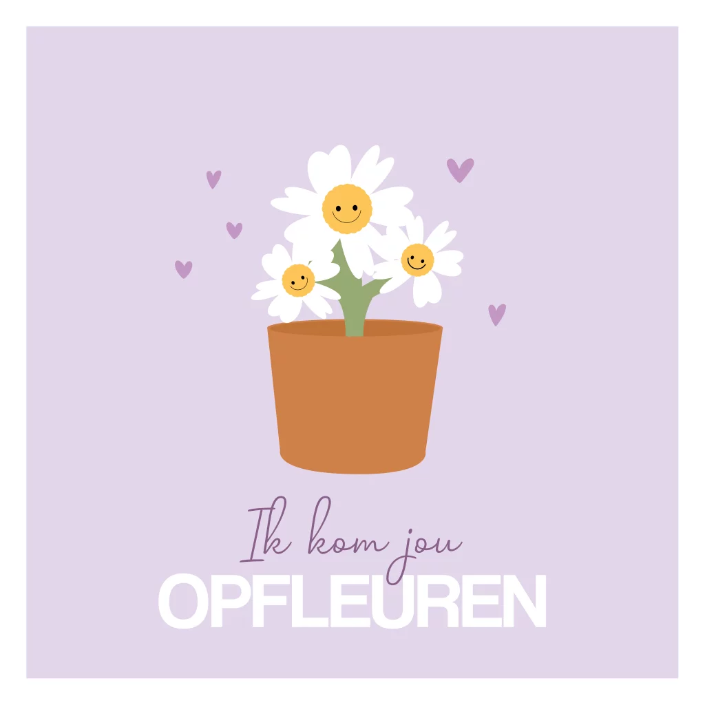 Stuur iemand deze opfleurende beterschapskaart! Op deze kaart zie je blije madeliefjes in een bloempot met daaromheen paarse hartjes. Op deze beterschapskaart staat 'Ik kom jou opfleuren' en dit zorgt voor een glimlach op het gezicht van de ontvanger.