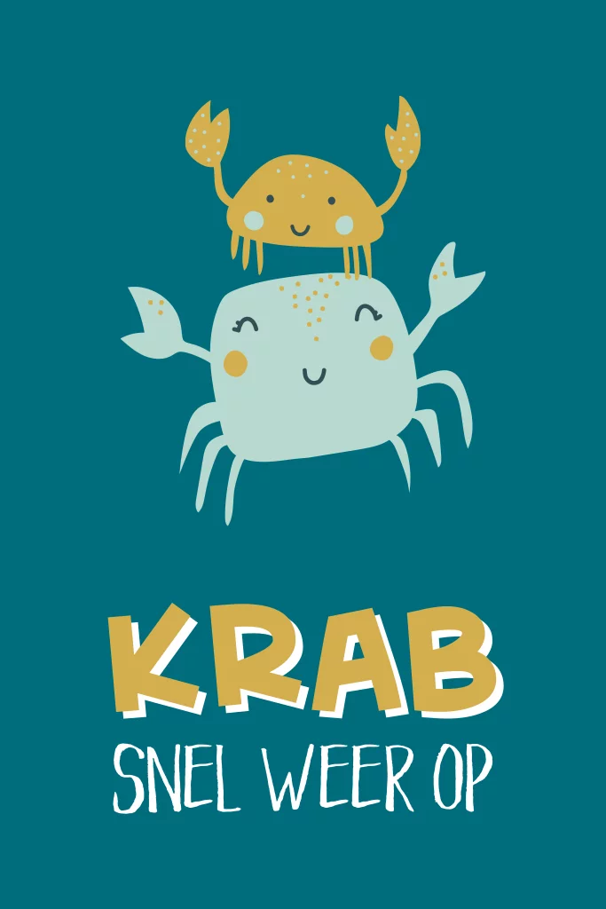 Wens iemand een spoedig herstel met deze originele krab beterschapskaart. Op deze kaart zie je een blije grote krab en een blij klein krabbetje. Onder deze krabbetjes staat de tekst 'krab snel weer op'. Hopelijk krabbelt diegene snel weer op na het ontvangen van deze beterschapskaart.