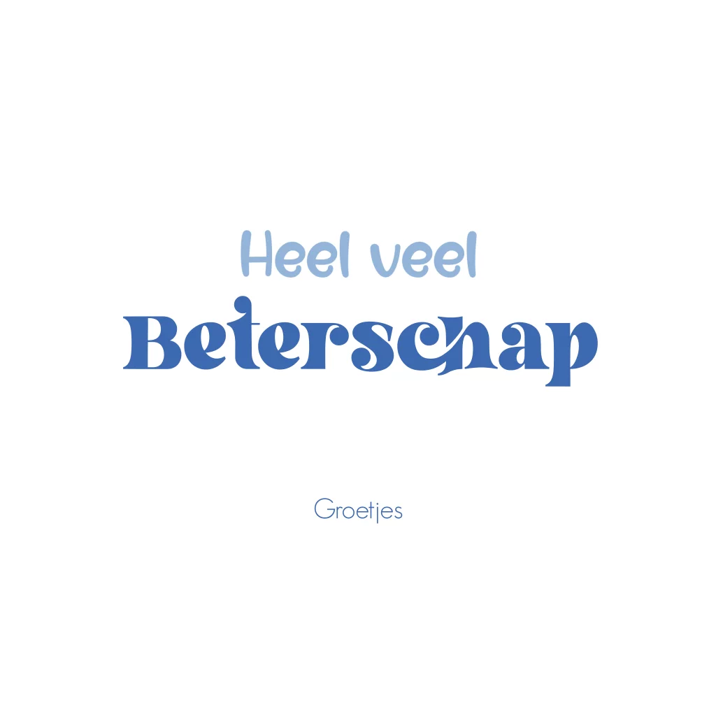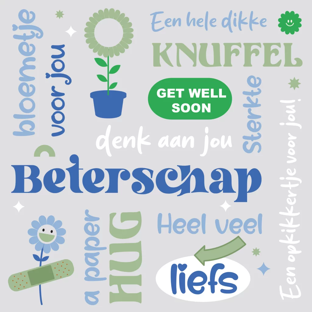Deze beterschapskaart is de perfecte manier om iemand op te vrolijken en beterschap te wensen. Deze kaart heeft allerlei lieve typografische teksten met beterschapswensen in verschillende kleuren.