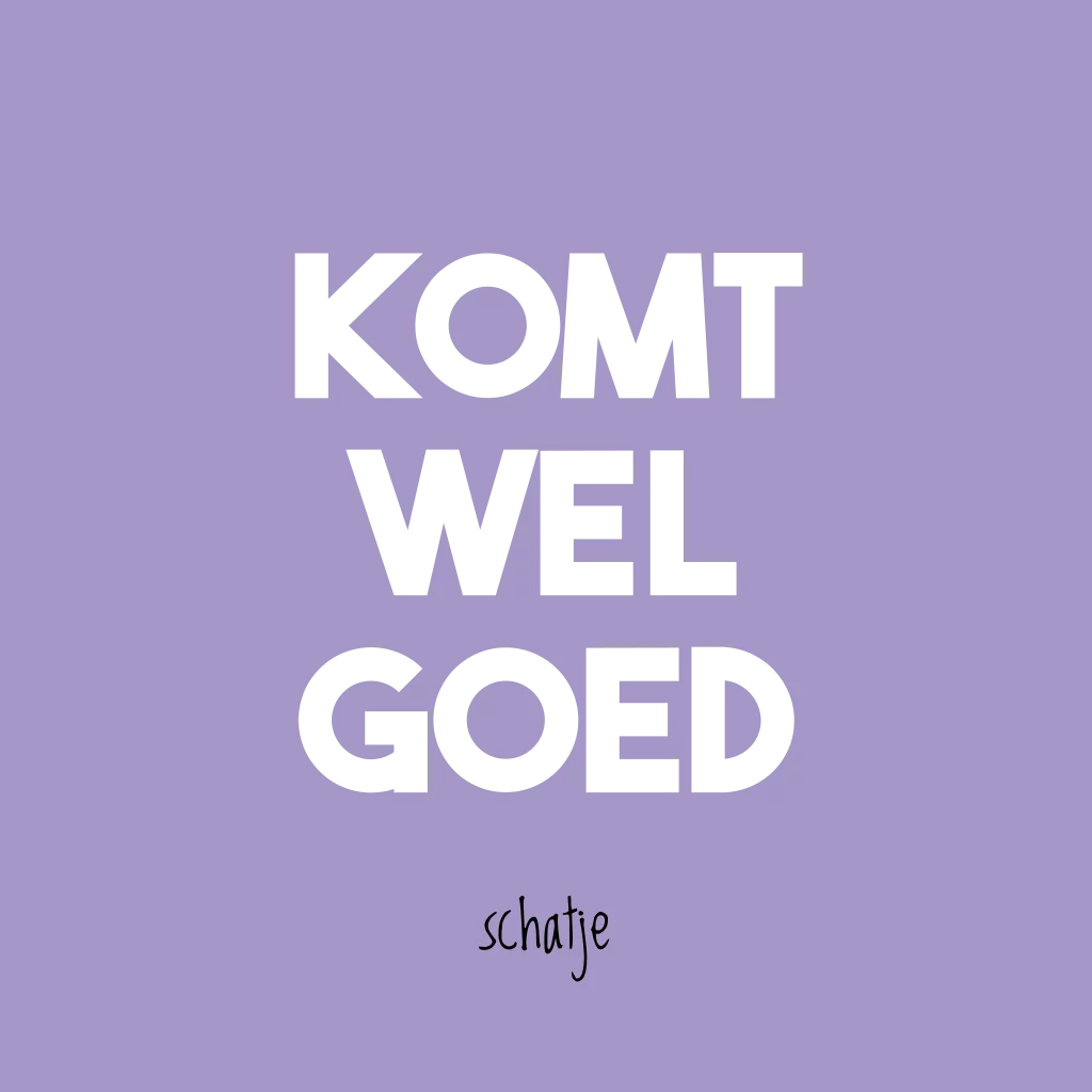 Wenskaart om te laten weten dat je aan iemand denkt of beterschap wenst. De kaart is typografisch met een paarse achtergrond en in goudfolie de tekst 'Komt wel goed schatje'.
