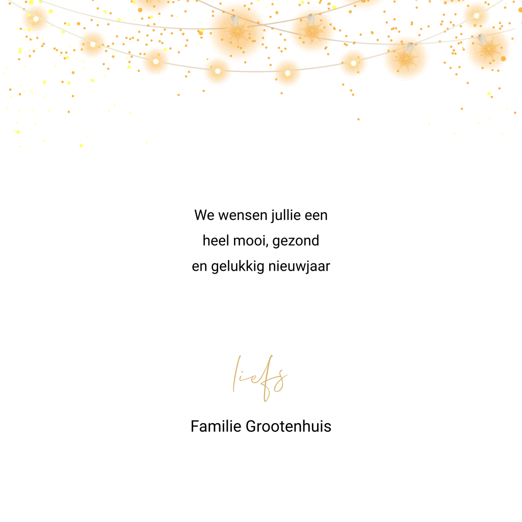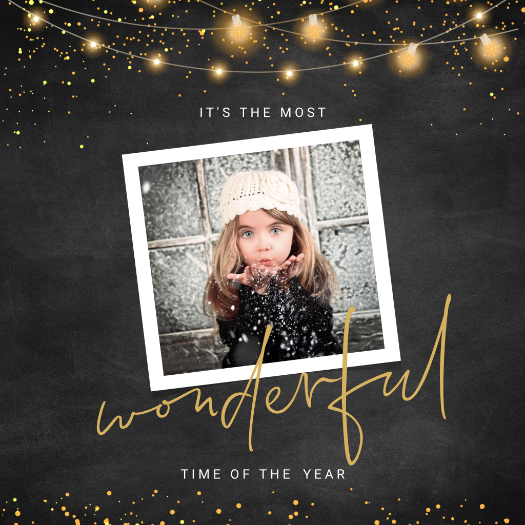 It's the most wonderful time of the year! Wenskaart voor de feestdagen met sfeervolle brandende lichtjes op een krijtbord achtergrond. Vervang de foto voor een eigen foto en voeg je eigen kerstgroet toe.