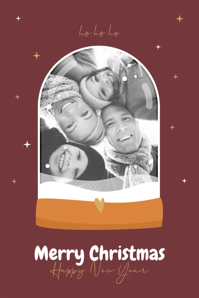 Hippe wenskaart kerst met foto in sneeuwbol