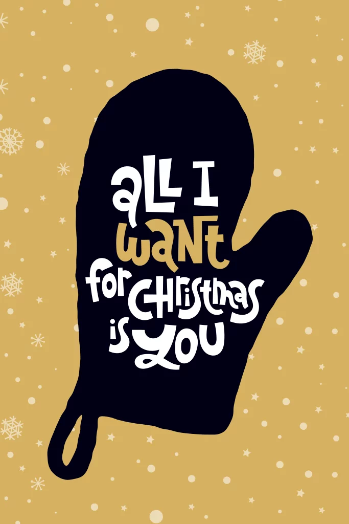 Grappige goudkleurige kerstkaart met sneeuw en ovenwant met de tekst 'All I want for Christmas is you'.