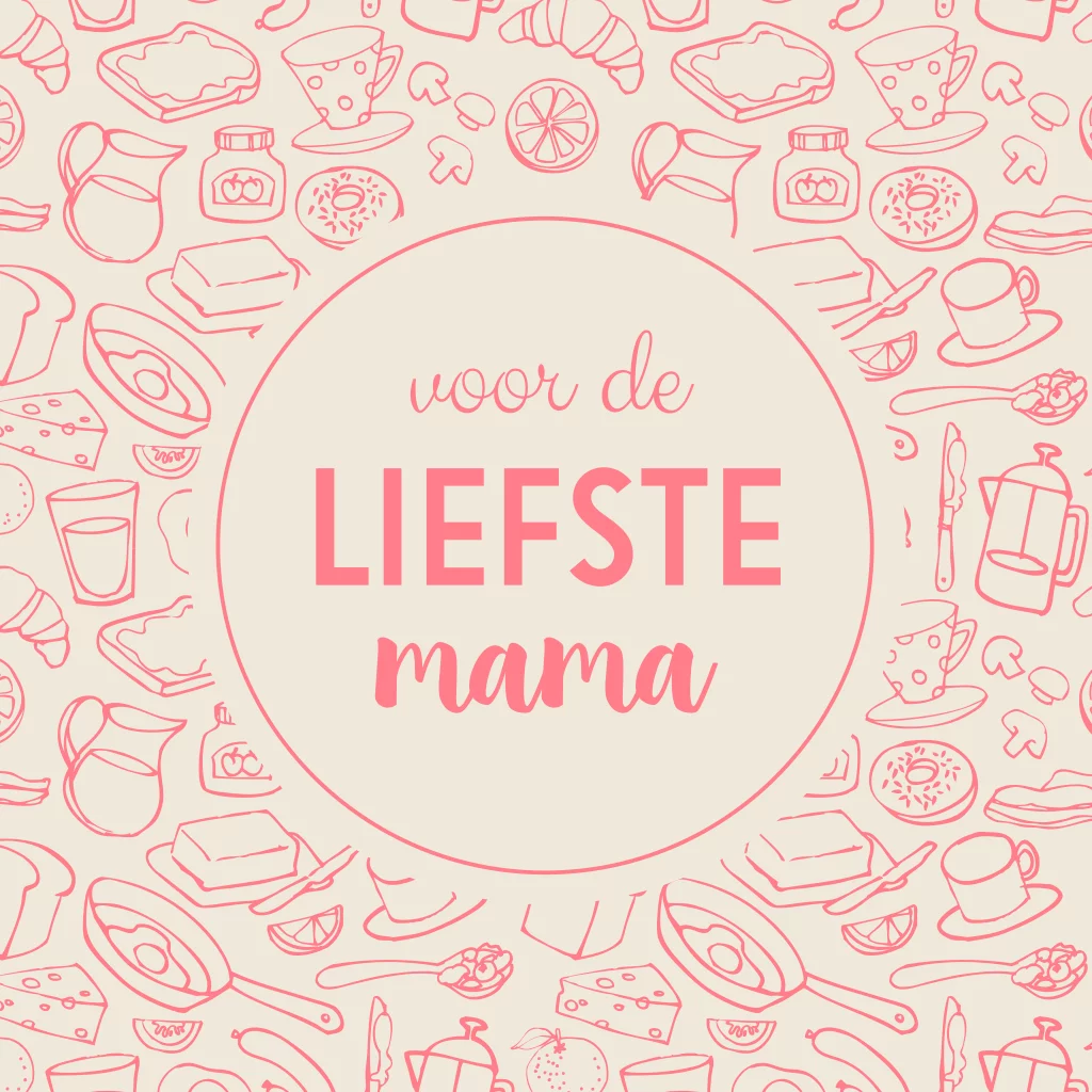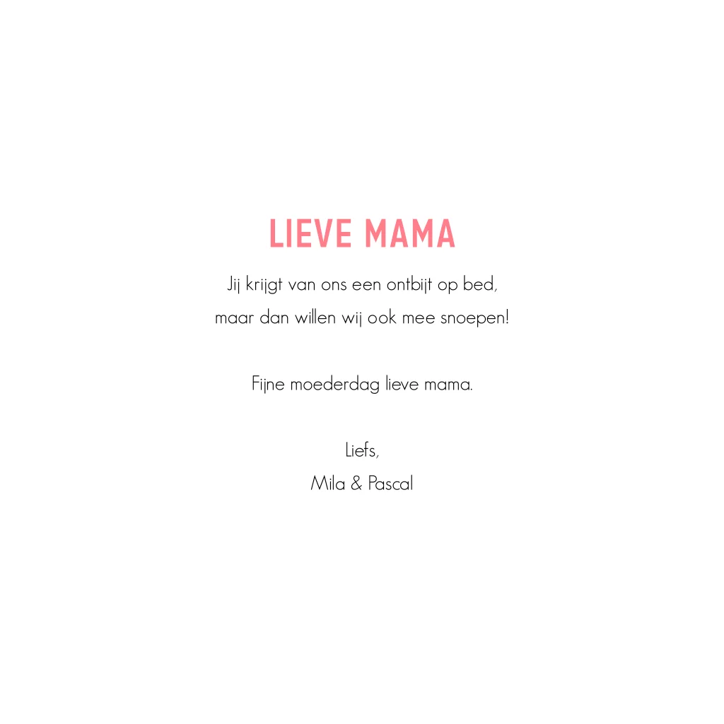 Verwen jouw allerliefste mama met een lekker ontbijt op bed en daar hoort natuurlijk een lief kaartje bij. Op deze moederdagkaart illustraties van broodjes, een gebakken eitje, verse jus en een kopje koffie. Voeg een eigen persoonlijke boodschap toe op de binnenzijde van deze kaart.