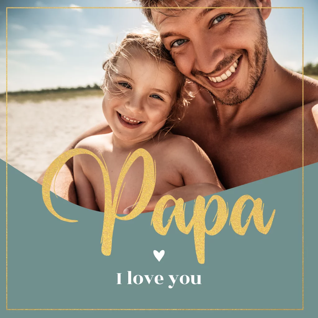 Wenskaart voor Vaderdag met goudlook, eigen foto en de tekst 'papa, I love you'. Deze hippe kaart is de perfecte manier om je vader te feliciteren met Vaderdag. Plaats een mooie foto van jezelf samen met je vader op deze wenskaart. De wenskaart is versierd met een modern design in blauw/groen met goudlook accenten. Pas de kleuren, teksten en lettertypen gemakkelijk aan in de editor.