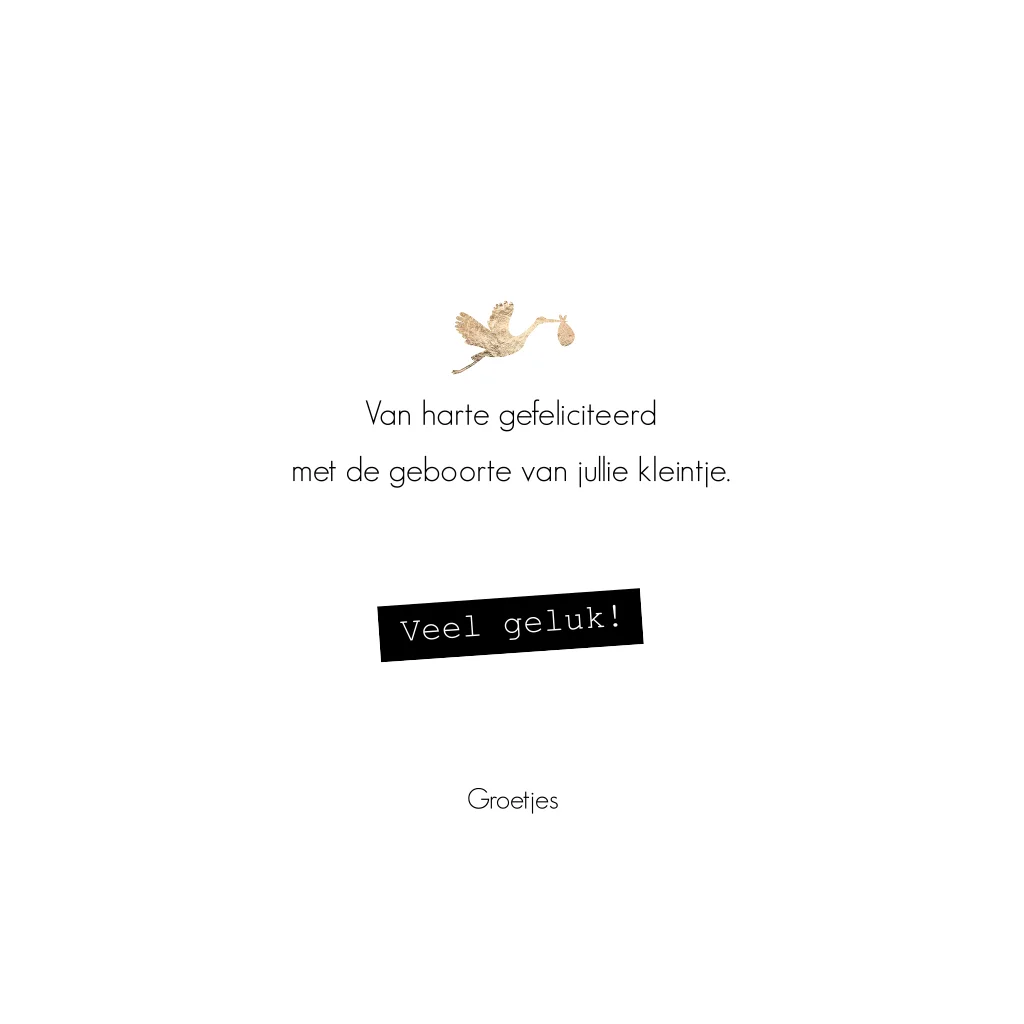 Hippe kaart in zwart-wit om de kersverse ouders te feliciteren met de geboorte van hun kindje. Op deze kaart staat de tekst "hoera een mini versie van jullie samen" en een goudkleurige ooievaar. Zowel geschikt voor een meisje/dochter als voor een jongen/zoon.