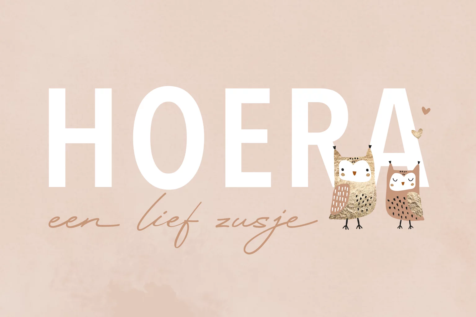 Felicitatiekaart om de kersverse ouders en grote zus te feliciteren met de geboorte van een baby zusje. Dit kaartje heeft een roze aquarel achtergrond en 2 lieve uiltjes.