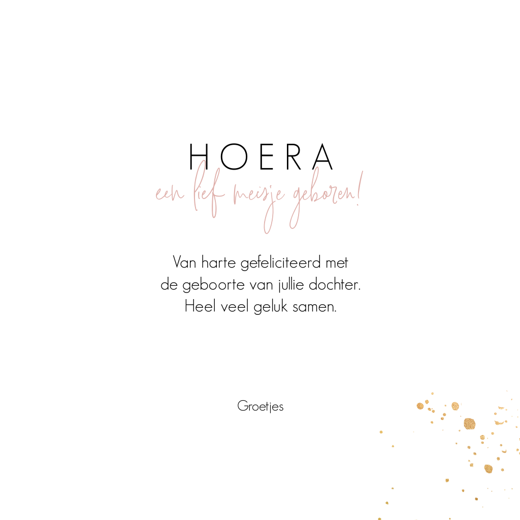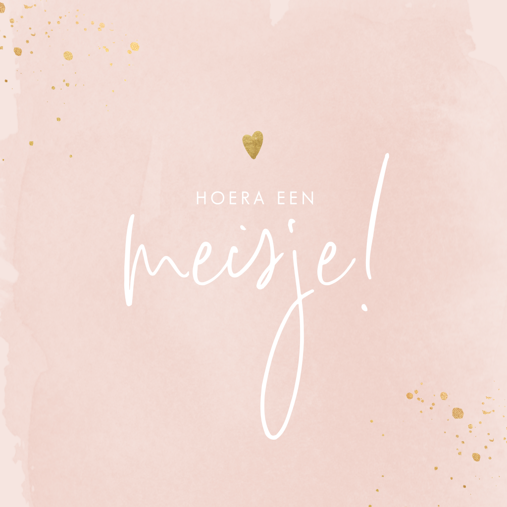 Hoera een meisje! Felicitatiekaart voor de geboorte van een dochter met roze watercolor, gouden spetters en een klein hartje. Voeg een persoonlijke gelukswens toe op de binnenzijde.