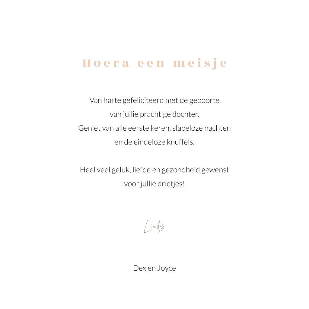 Heeft iemand in je omgeving een meisje gekregen? Feliciteer ze met de geboorte van hun dochter met deze prachtige wenskaart. Op deze wenskaart zie je een ooievaar met een meisje in een doek vliegen. Op de achtergrond staan oudroze/paarse strepen.