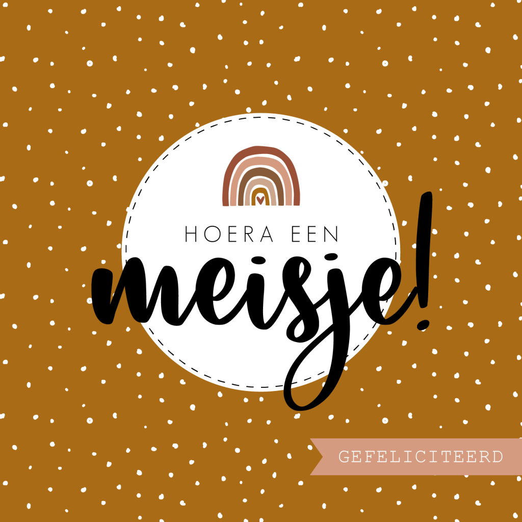 Mooie wenskaart om de kersverse ouders te feliciteren met de geboorte van hun dochter. Op dit kaartje staat de tekst "Hoera een meisje" met een klein regenboogje en op de achtergrond een stipjes patroon.