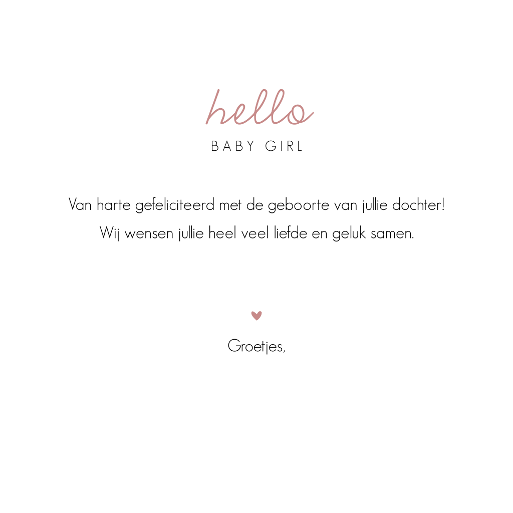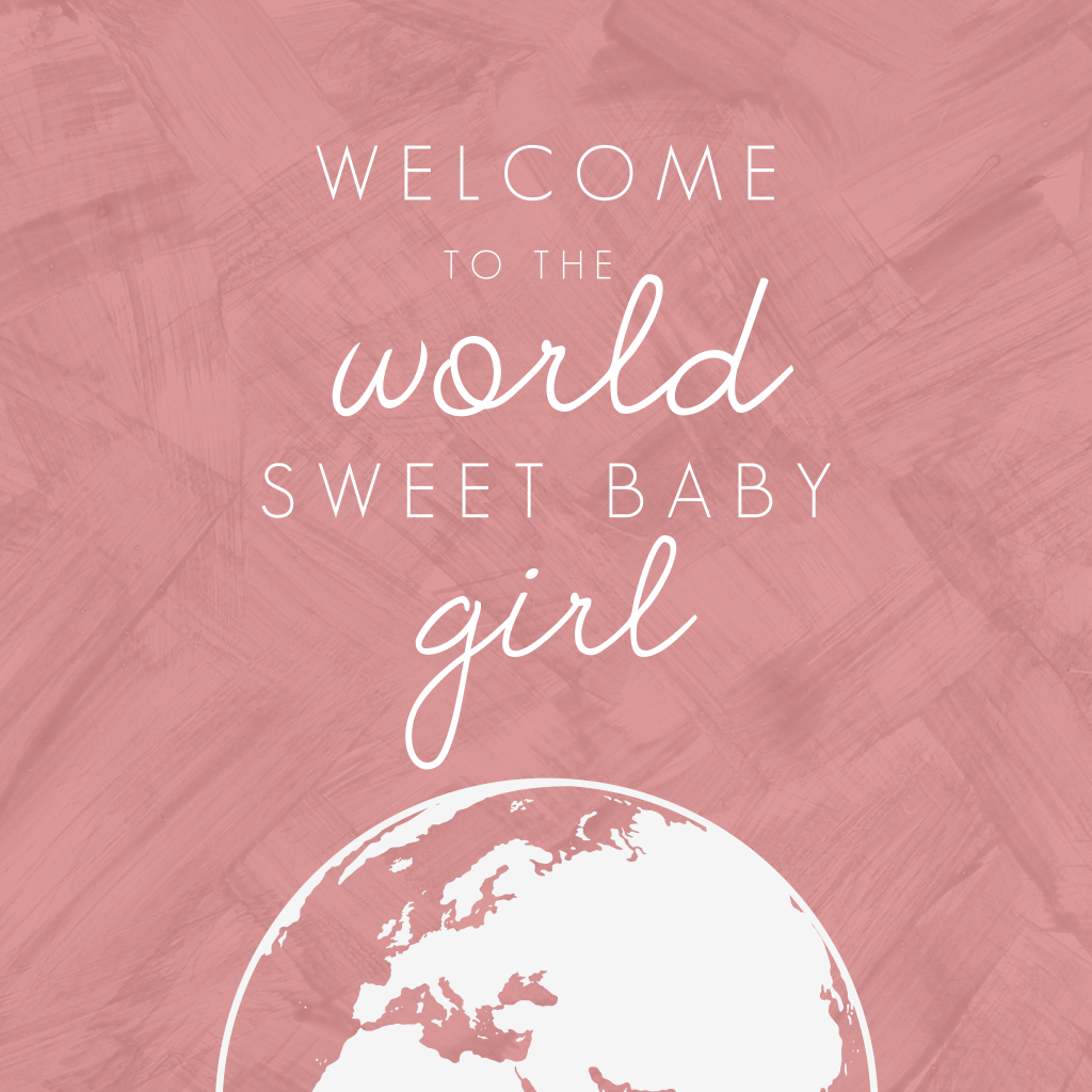 Hippe felicitatie kaart voor de geboorte van een dochter. Op deze kaart de tekst "Welcome to the world sweet baby girl" in een mooie combinatie van strakke en sierlijke lettertypes, boven een wereldbol.