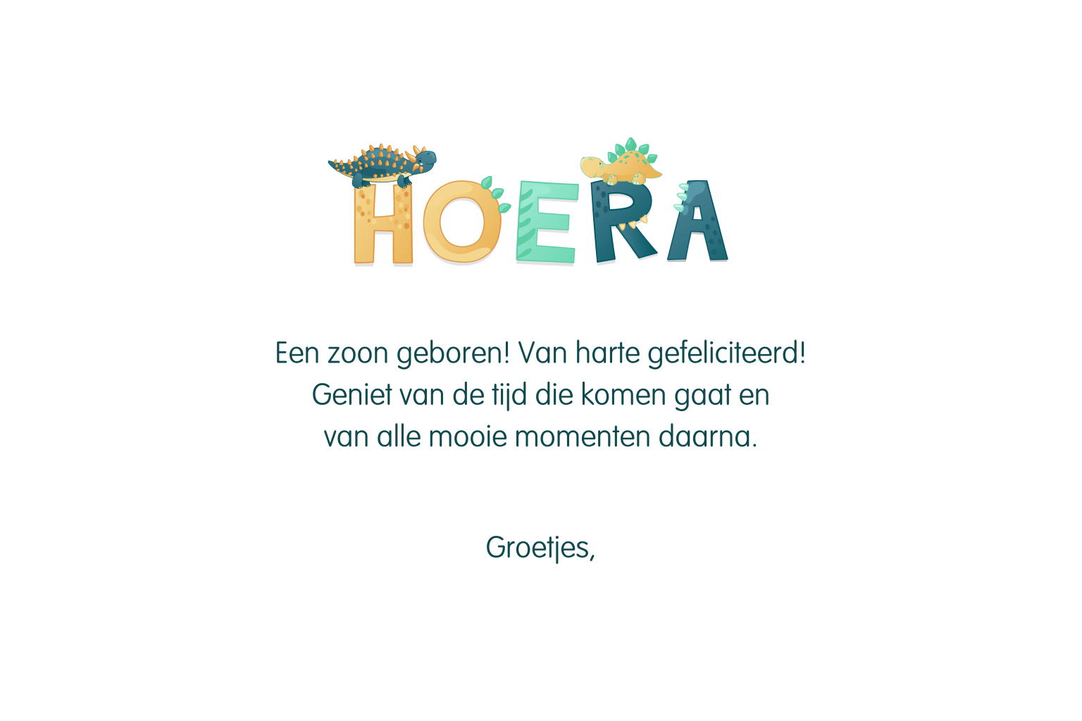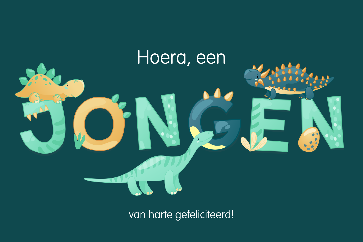 Verstuur deze vrolijke felicitatiekaart voor de geboorte van een zoon. Op deze wenskaart staan kleurrijke letters in dino stijl. Verder op dit kaartje verschillende dinosaurussen en een dino ei. Voeg je persoonlijke tekst toe op de binnenzijde.