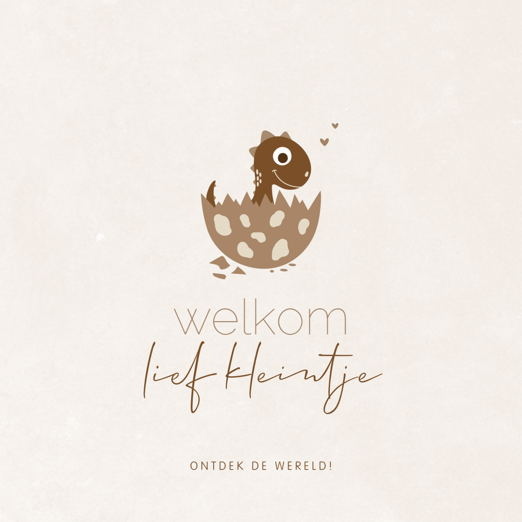"Welkom lief kleintje". Superlief felicitatiekaartje voor de geboorte van een meisje of jongen. Op deze wenskaart een baby dino die uit het ei komt en de wereld mag gaan ontdekken. De kleine hartjes maken het kaartje helemaal af.