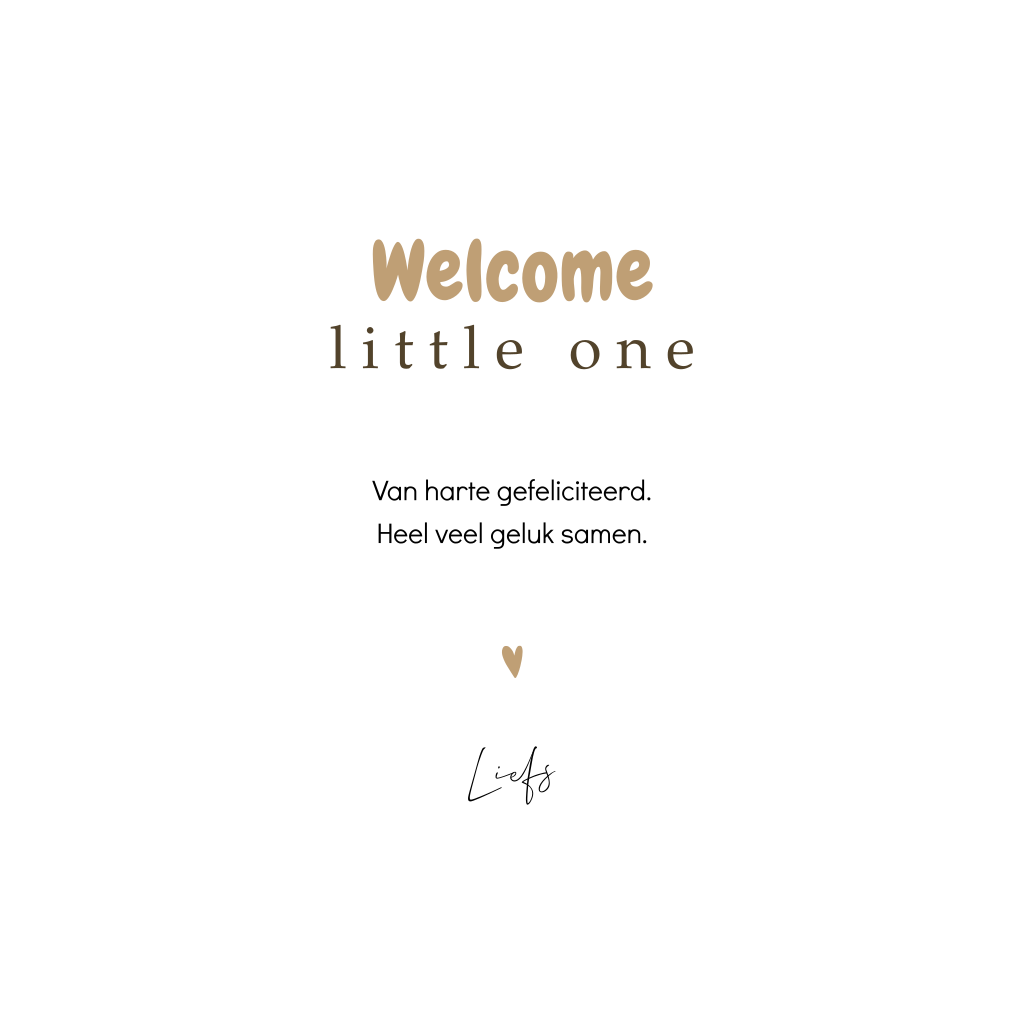 Hippe beige felicitatie kaart voor de geboorte van een zoon of dochter. Op deze kaart de tekst "Welcome little one, let the adventures begin" in een mooie combinatie van strakke en sierlijke lettertypes. Grappig detail is de kop van een schattig tijgertje in de tekst one.