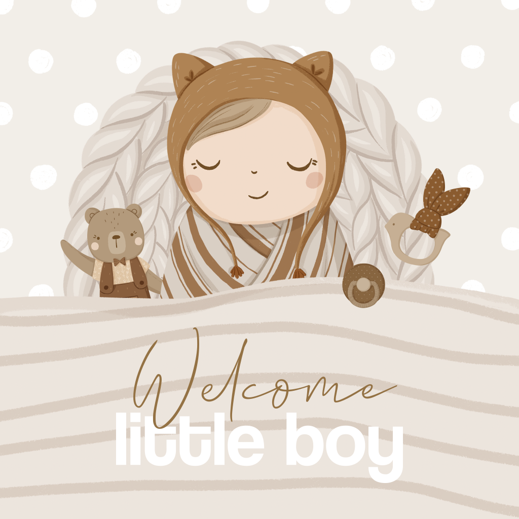 Op deze felicitatiekaart voor de geboorte van een zoon zie je een slapend kindje in een bedje. Het is een trendy kaart met beige kleuren en tekst in verschillende strakke en sierlijke lettertypes. Deze kaart is perfect om de ouders te feliciteren met de geboorte van hun little boy! Er is ook een versie met een donker kindje.