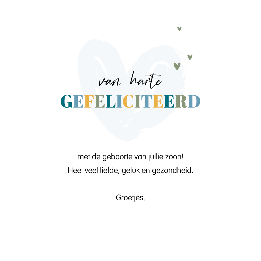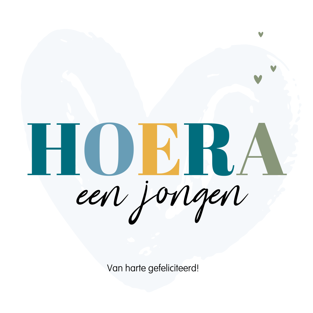 "Hoera een jongen." Stuur de trotse ouders van een zoon dit prachtige wenskaartje. Op dit felicitatiekaartje "Hoera" in verschillende kleuren. Op de achtergrond een groot lichtblauw hart. Speciaal voor de kleine hartendief!
