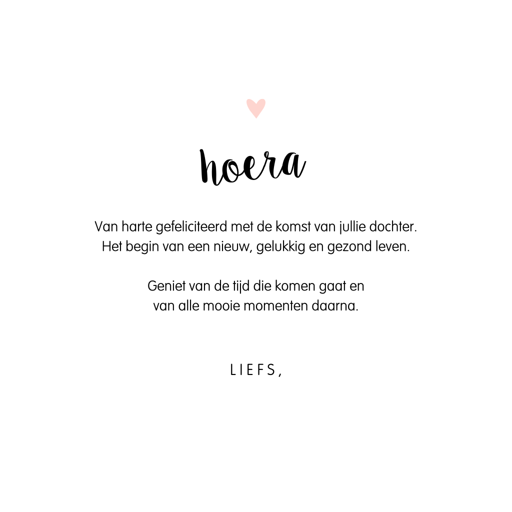 Feestelijk felicitatie geboortekaartje voor een meisje. Op deze wenskaart een lachende giraf met feestmuts op en in zijn bek ballonnen aan een touwtje. De kleine hartjes en de aquarel veeg op de achtergrond maken het wenskaartje helemaal af.