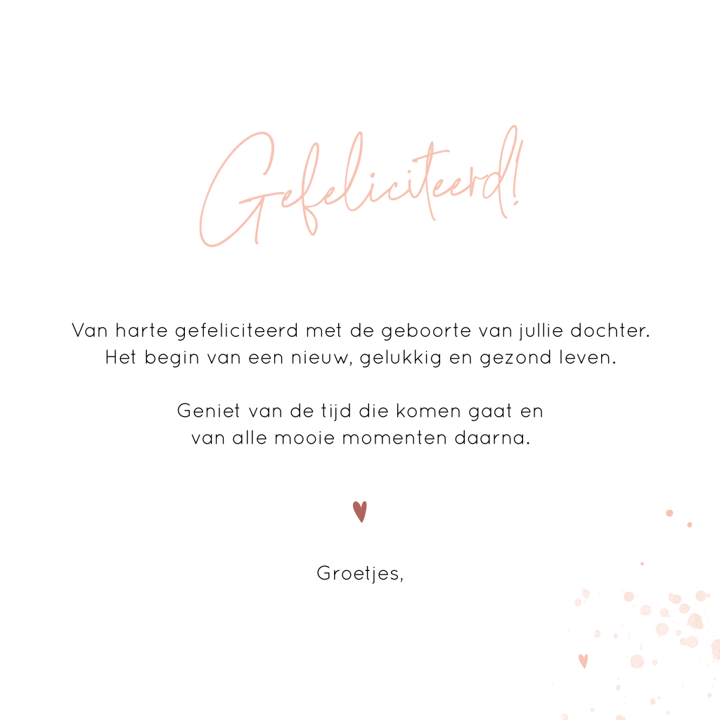 Hip wenskaartje om de trotse ouders te feliciteren met de geboorte van hun dochter: hun eigen baby girl! Op dit felicitatiekaartje "Girl" in grote sierlijke letters voor een velvetlook achtergrond met spetters en hartjes.