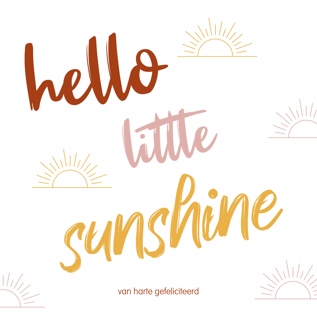 Felicitatiekaart voor de geboorte van een meisje. Op dit wenskaartje de tekst "Hello little sunshine" en stralende, opkomende zonnetjes. Speciaal voor het pasgeboren, nieuwe zonnestraaltje!