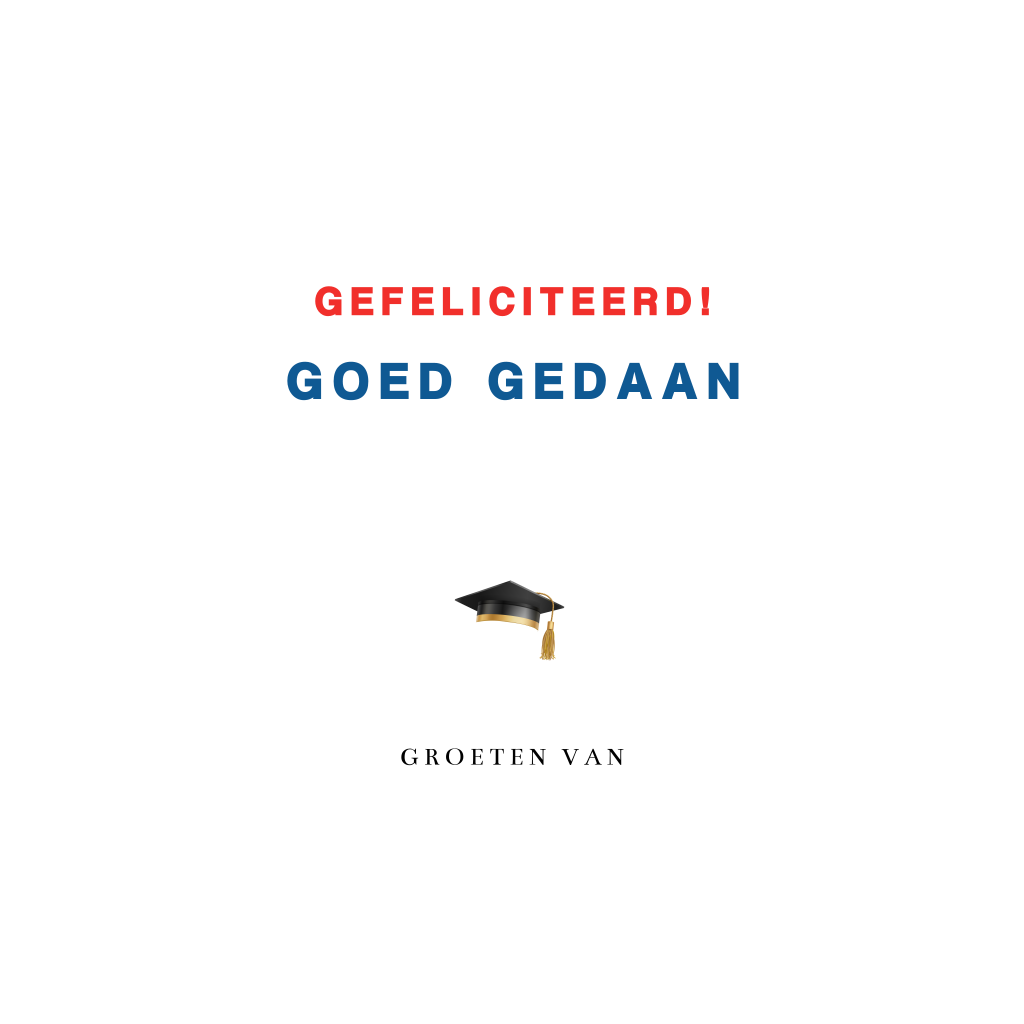 Felicitatiekaartje met "Hoera jij bent geslaagd" en de naam van de geslaagde op de voorzijde. Met een afstudeer hoedje en in de typische Hollandse kleuren rood, wit, blauw en oranje.