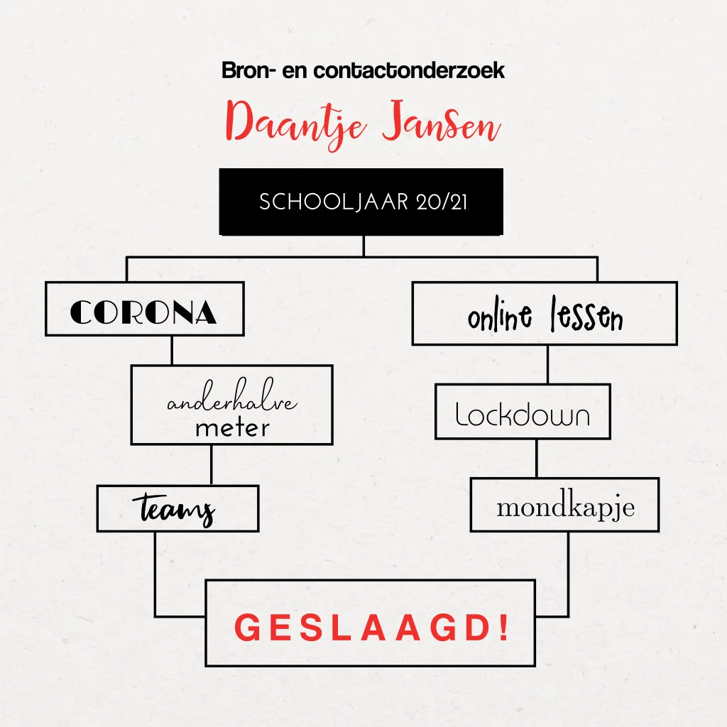 Op zoek naar een origineel kaartje voor iemand die geslaagd is in corona tijd? Op dit grappige felicitatiekaartje zijn veelvoorkomende termen van de corona pandemie d.m.v. een bron- en contactonderzoek verwerkt in een schema die uiteindelijk leidt naar: geslaagd! Gebruikte woorden zijn o.a. online lessen, anderhalve meter, teams, lockdown, mondkapje. Extra leuk om de naam van de geslaagde op de kaart te gebruiken.