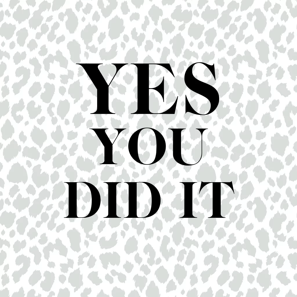 Welke party animal verdient dit kaartje omdat hij of zij geslaagd is? Op dit kaartje in grote, zwarte letters de tekst "Yes, you did it", voor een hippe panterprint op de achtergrond.