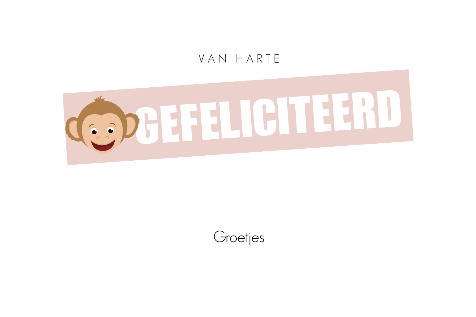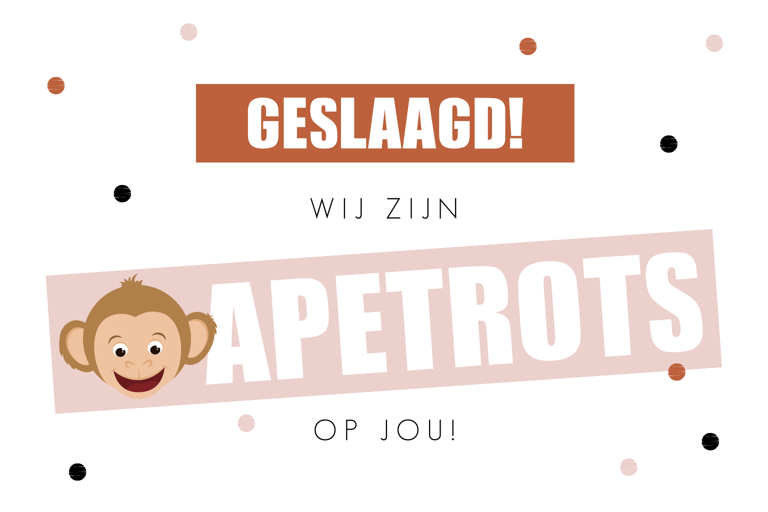 Vrolijke geslaagd kaart met confetti, aapje en de tekst "apetrots op jou."