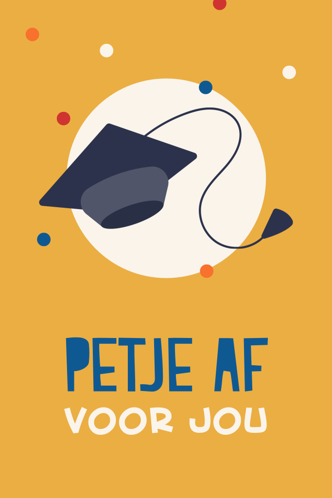 Wenskaart met de tekst 'petje af voor jou' met confetti en een geslaagd examen hoedje. Het is een leuke en vrolijke kaart om te sturen naar iemand die net zijn of haar examen heeft gehaald.