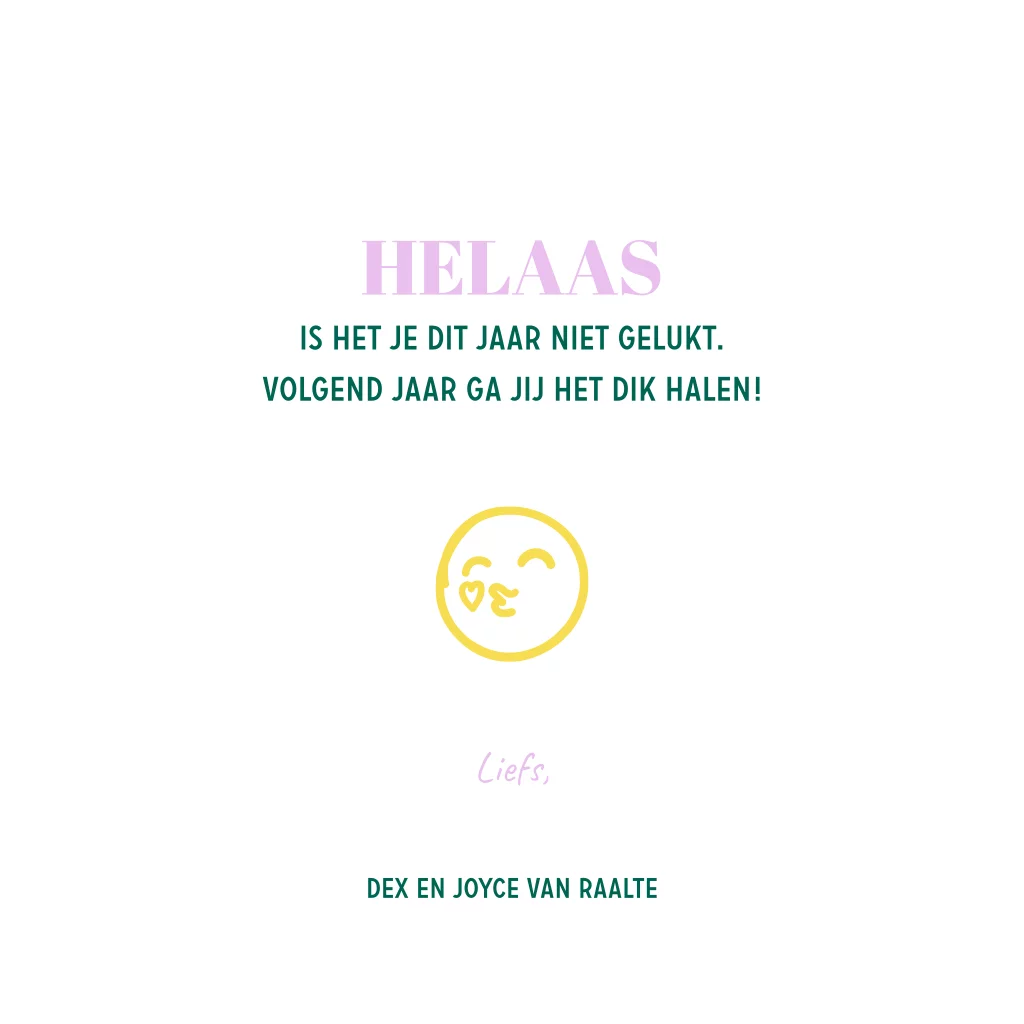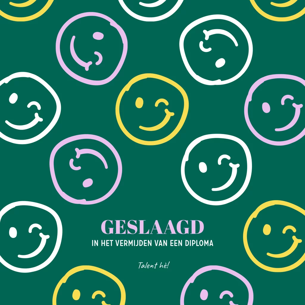 Wenskaart voor iemand die gezakt is voor zijn of haar examens, school of opleiding. Op deze wenskaart een groene achtergrond met knipogende smileys en de tekst 'Geslaagd in het vermijden van een diploma'. Laat hiermee weten dat je aan diegene denkt. Pas naar eigen wens aan in de editor.