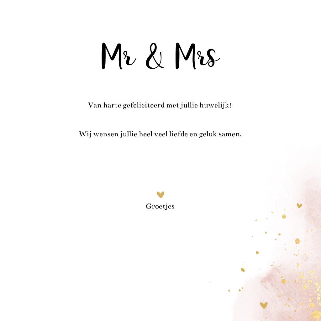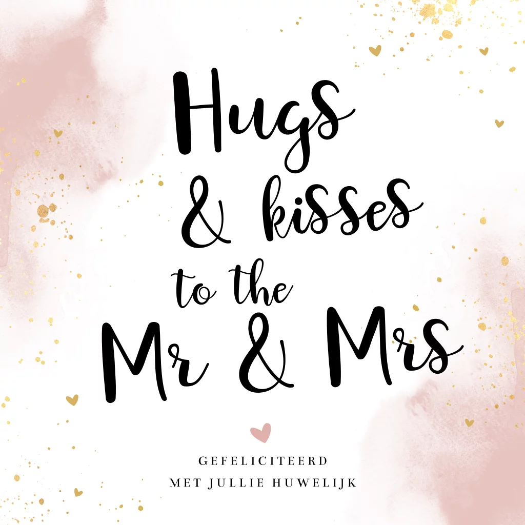 Felicitatiekaart voor een pas getrouwd stel met aquarel, hartjes en spetters. De tekst "Hugs & kisses to the Mr & Mrs" staat op de voorzijde in grote, sierlijke letters. Superlief om aan het dolgelukkige bruidspaar te sturen!