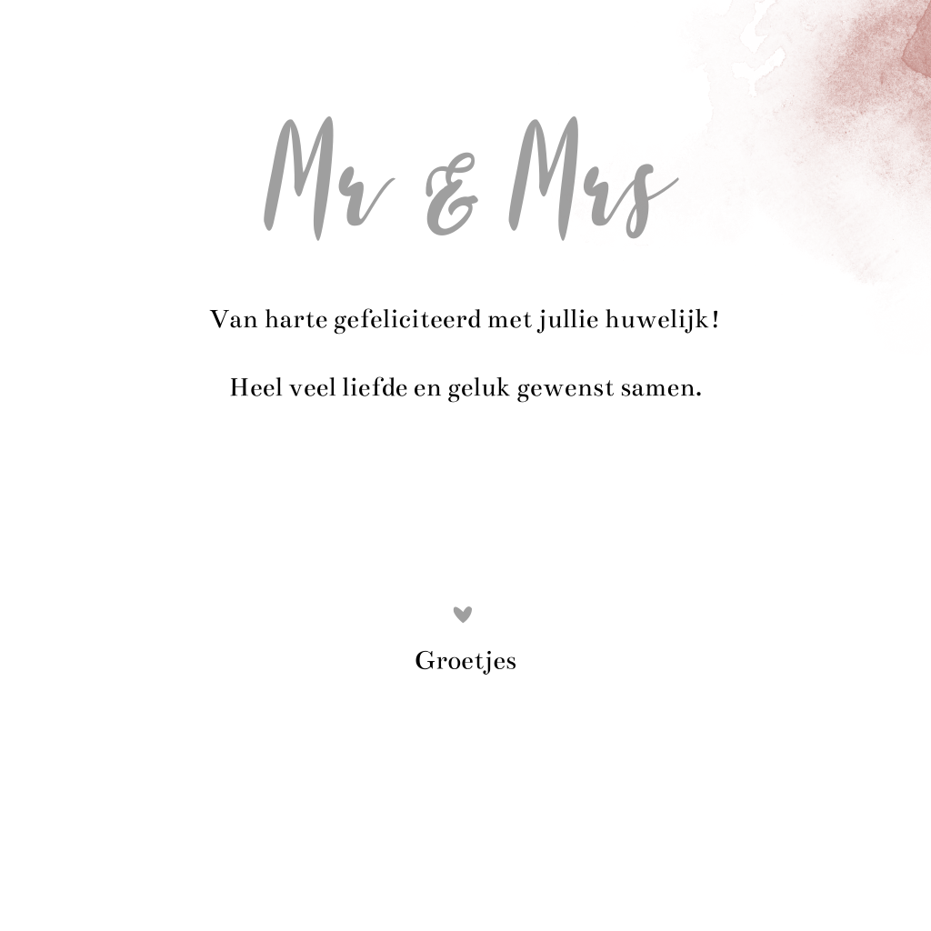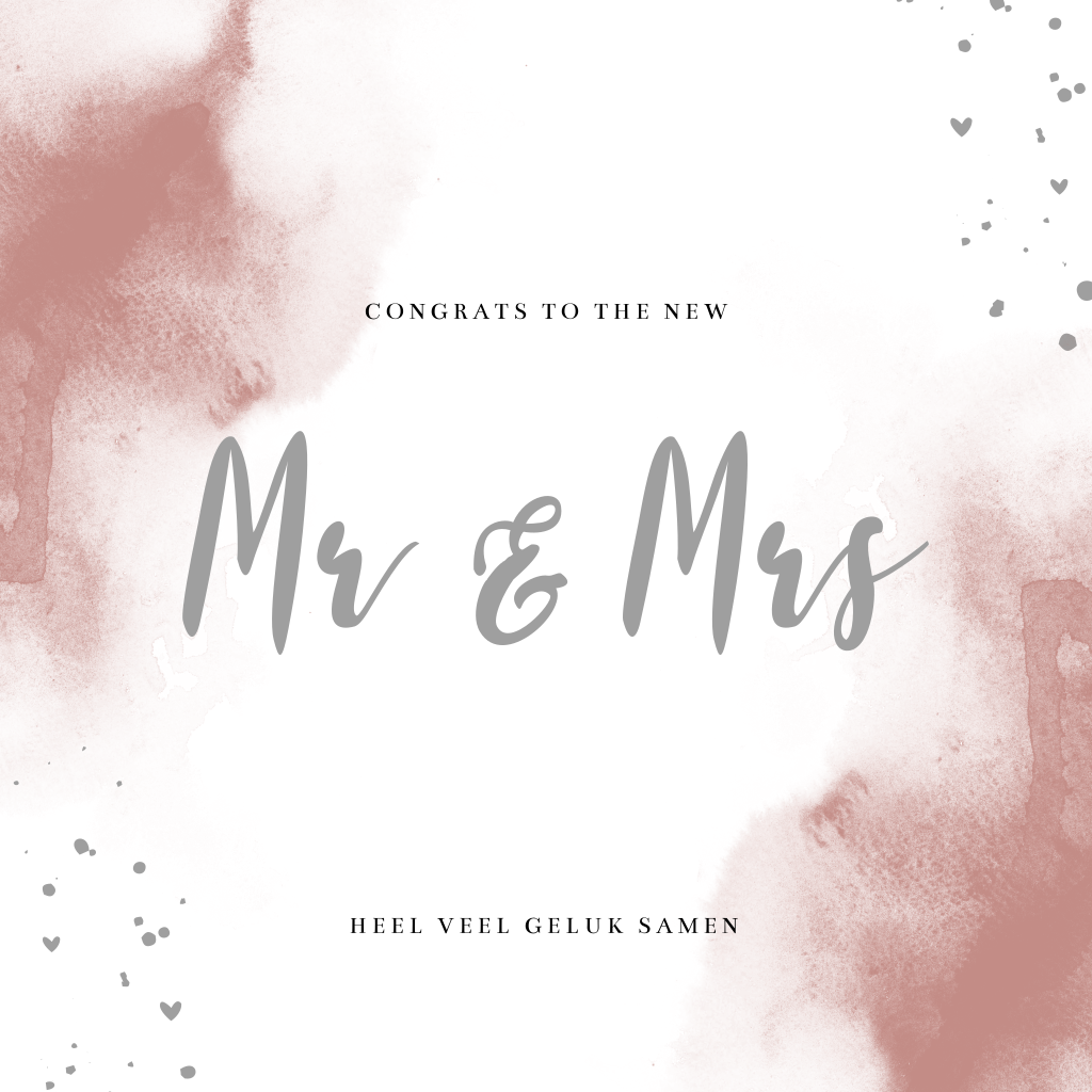 Mooie felicitatiekaart voor een huwelijk met aquarel vegen, hartjes en spetters. De tekst Mr & Mrs staat op de voorzijde in sierlijke letters. Superleuk om aan het dolgelukkige bruidspaar te sturen!