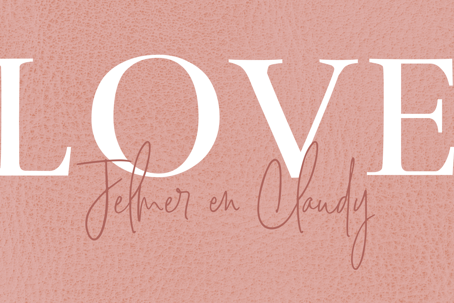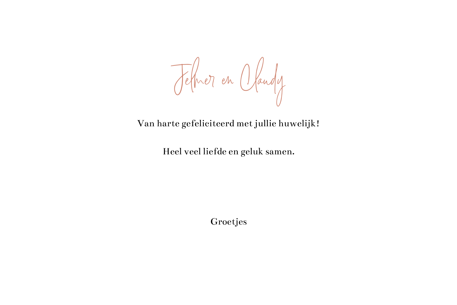 Feliciteer het bruidspaar met hun huwelijk met deze mooie wenskaart. Op de voorzijde staat groot het woord "Love" met daaronder de namen van het bruidspaar in mooie sierlijke letters. Pas de namen aan en verstuur zo een uniek en persoonlijk kaartje!