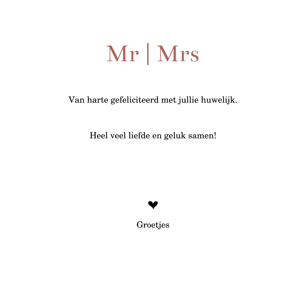 Wenskaart om een kersvers bruidspaar met hun huwelijk te feliciteren. Deze kaart heeft een trendy achtergrondkleur in betonlook en een getekende bloemenkrans met de tekst Mr en Mrs. Voeg je persoonlijke gelukswens voor het koppel toe op de binnenzijde van deze felicitatiekaart.