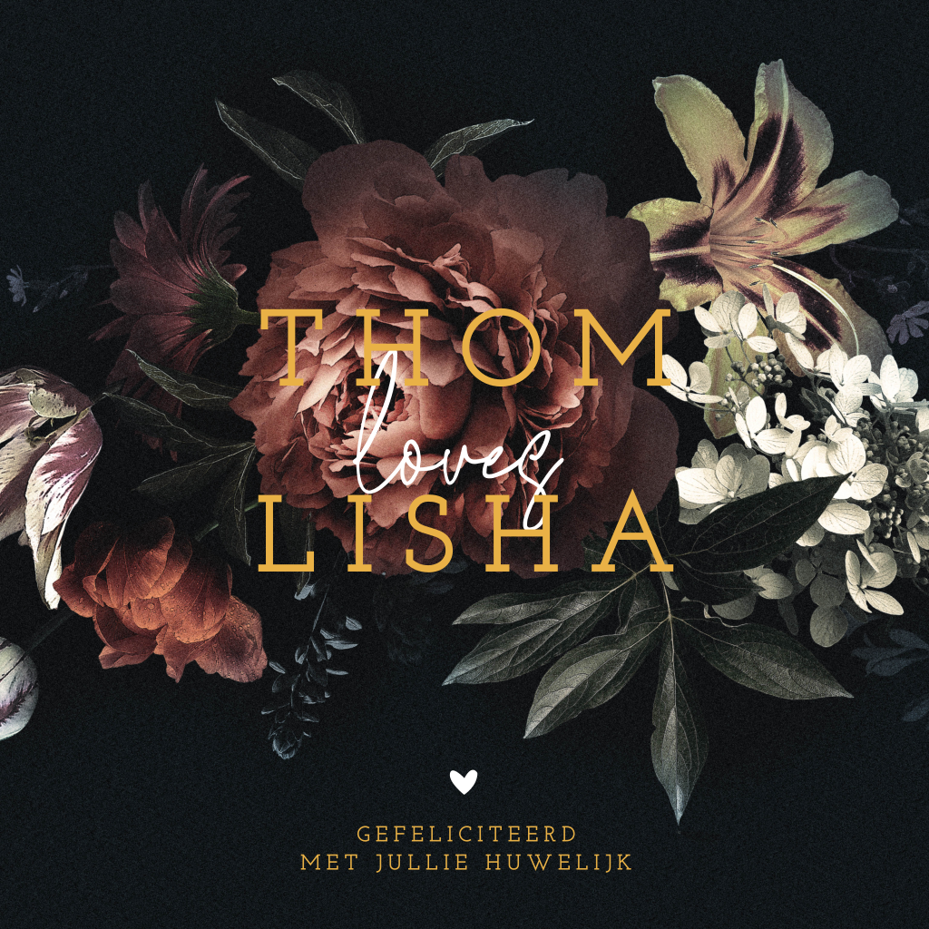 Mooie felicitatie kaart voor een huwelijk in zwart met romantische bloemen. Voeg de namen toe van het bruidspaar om zo een uniek en persoonlijk kaartje te sturen.