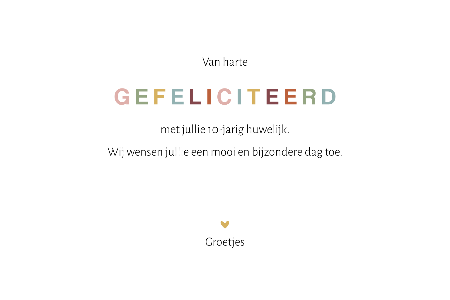 Vrolijke, kleurrijke wenskaart om een bruidspaar te feliciteren met hun 10-jarige huwelijk. Op deze kaart voor een tinnen bruidspaar teksten in verschillende lettertypes en kleuren, wat een feestelijk geheel geeft!