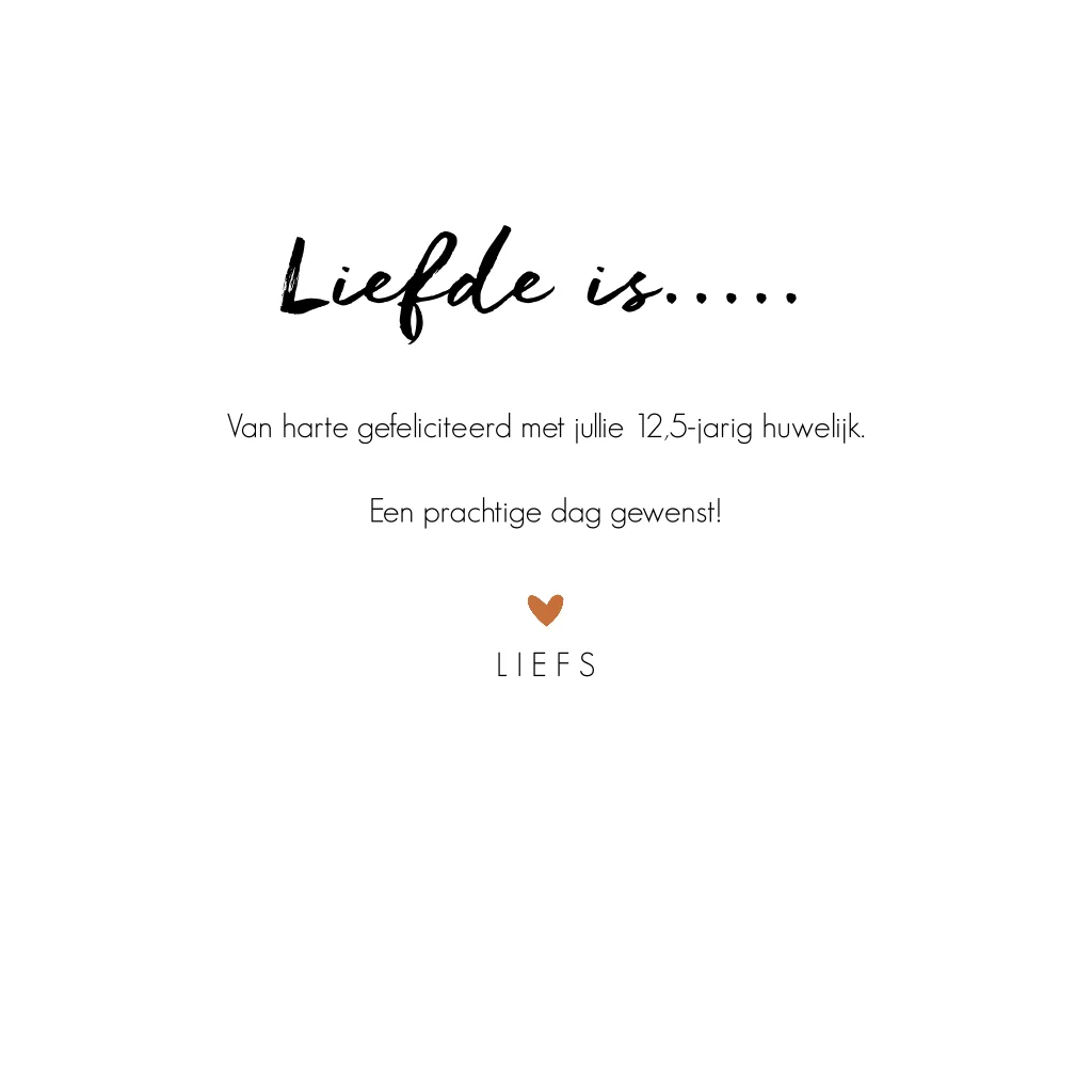 Is er een koppel in je omgeving 12,5 jaar getrouwd? Stuur het koperen bruidspaar dan dit lieve felicitatiekaartje met een groot hart en de passende tekst "Liefde is... voor altijd samen!".