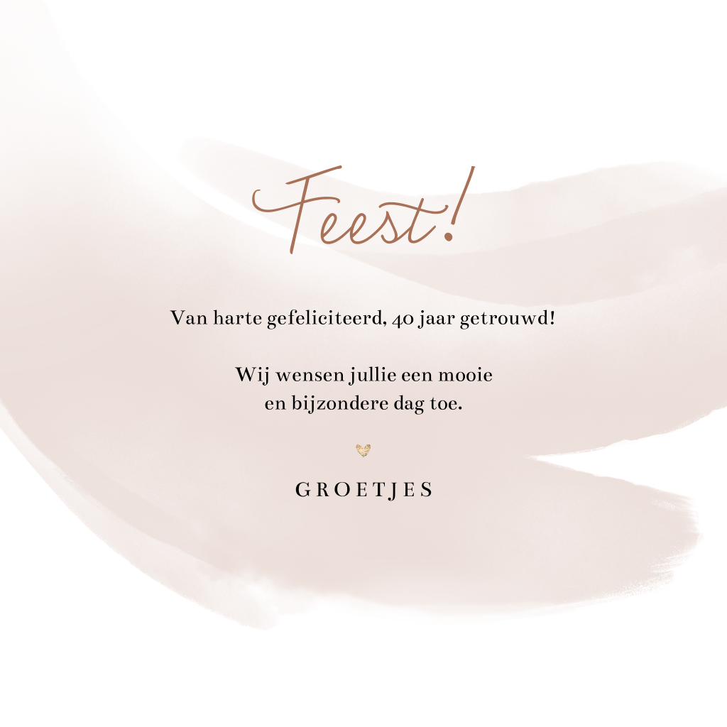 Romantische wenskaart voor een echtpaar wat al 40 jaar getrouwd is. In het midden van de kaart staat in goudlook het getal veertig. Op deze jubileumkaart getekende bloemen en een aquarel veeg.