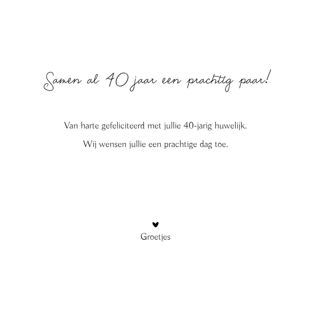 Is er een bruidspaar in jouw omgeving 40 jaar getrouwd? Stuur ze dan dit leuke kartonlook huwelijksjubileum felicitatiekaartje. 40 jaar getrouwd staat centraal op de kaart met daaromheen getekende witte bloemen en takjes.