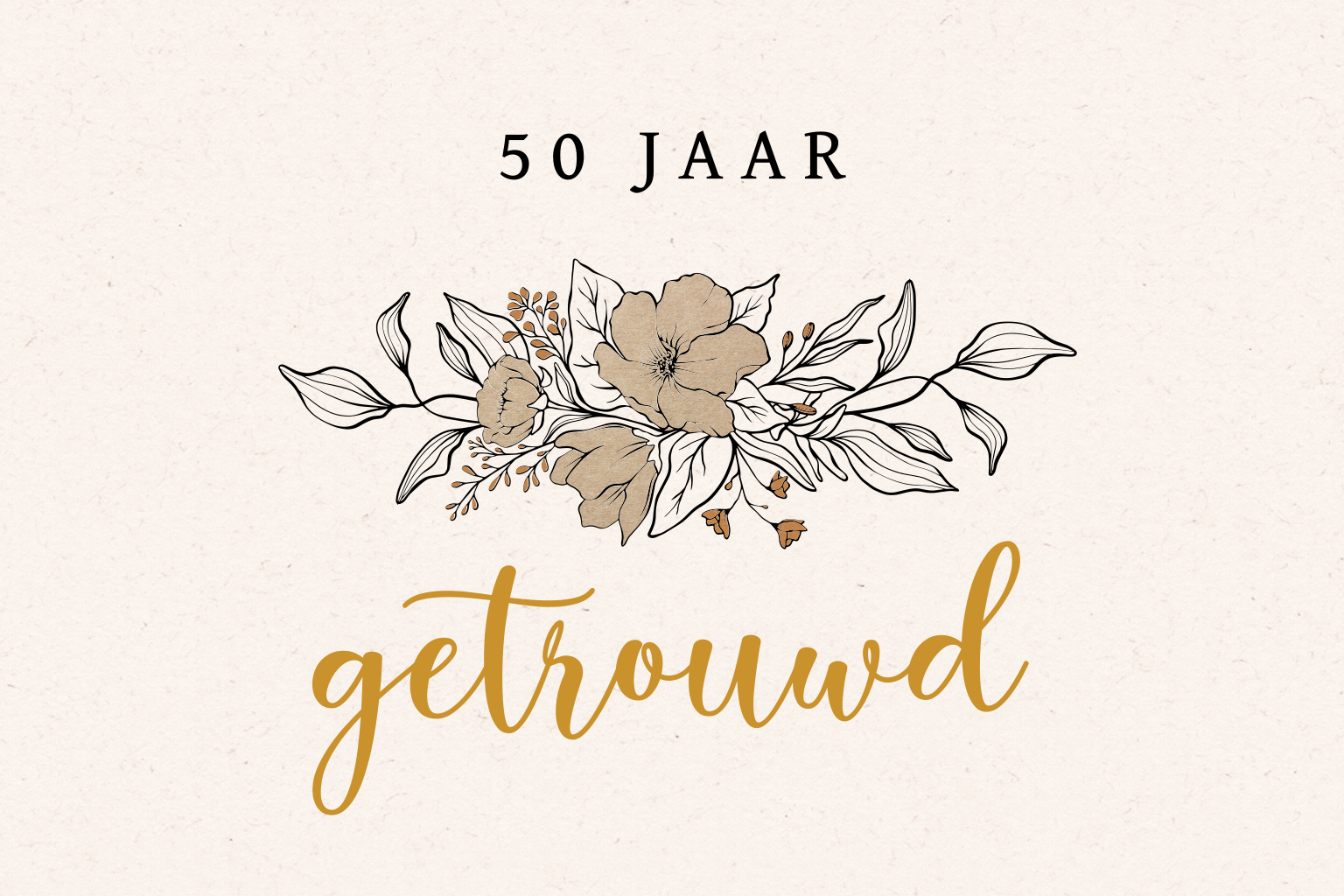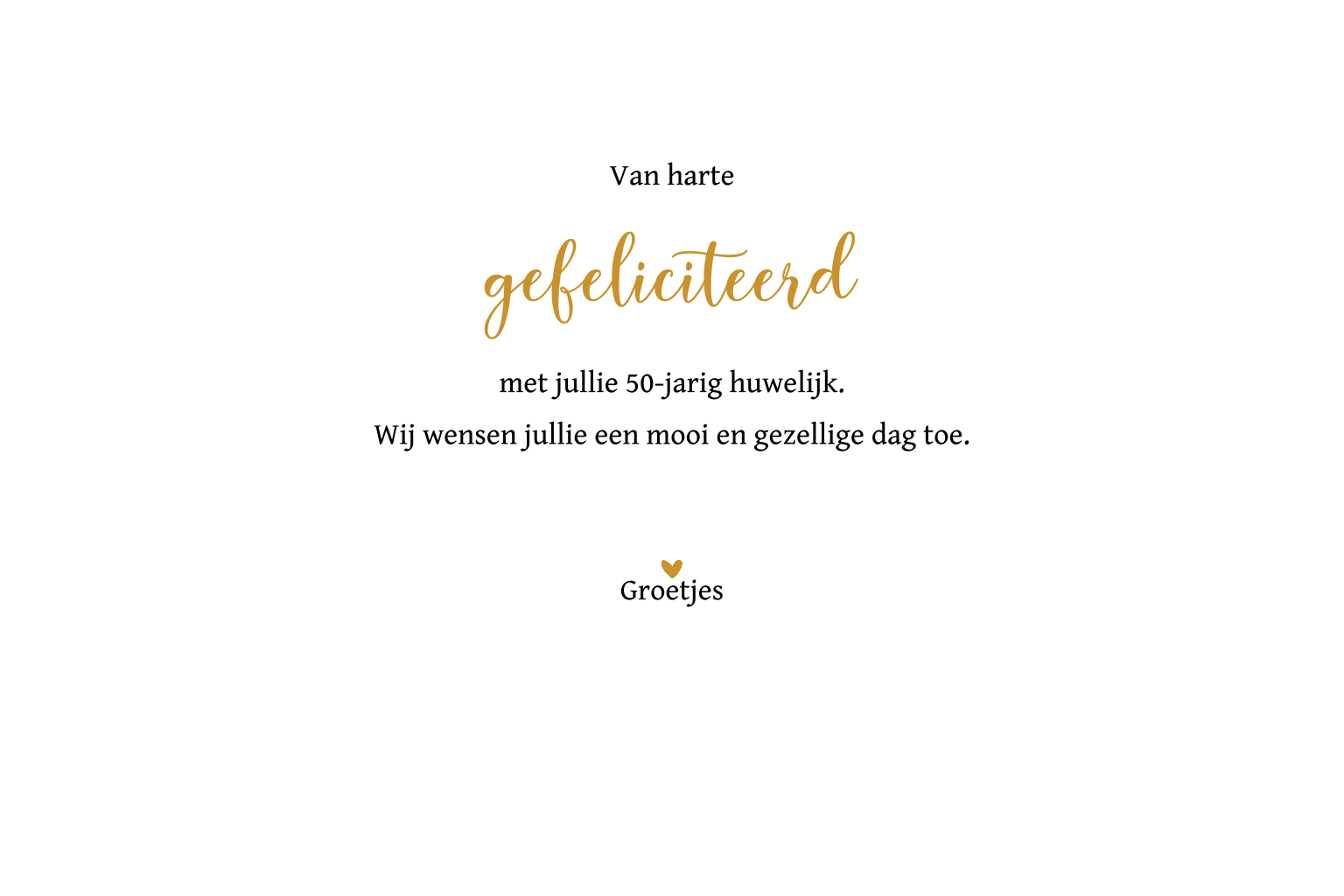 Stijlvolle felicitatiekaart voor een gouden echtpaar. In het midden van dit kaartje voor 50 jaar getrouwd een prachtig bloemstuk.
