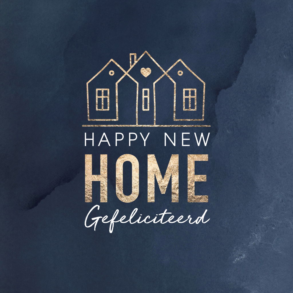 Happy New Home! Ken je iemand die gaat samenwonen? Of verhuizen? Verstuur dan deze felicitatiekaart met een strakke illustratie van goudkleurige huisjes. Op de achtergrond donkerblauw aquarel. Voeg je persoonlijke felicitatie toe op de binnenzijde.
