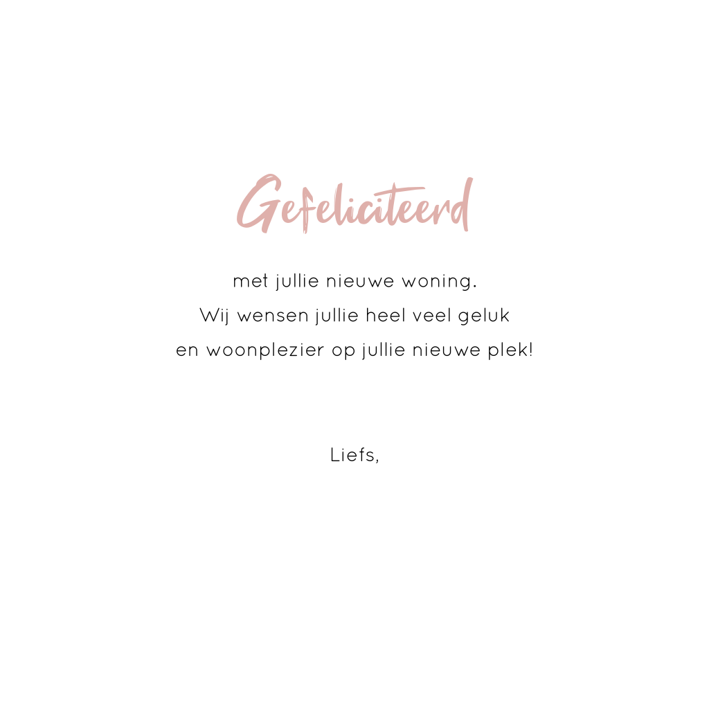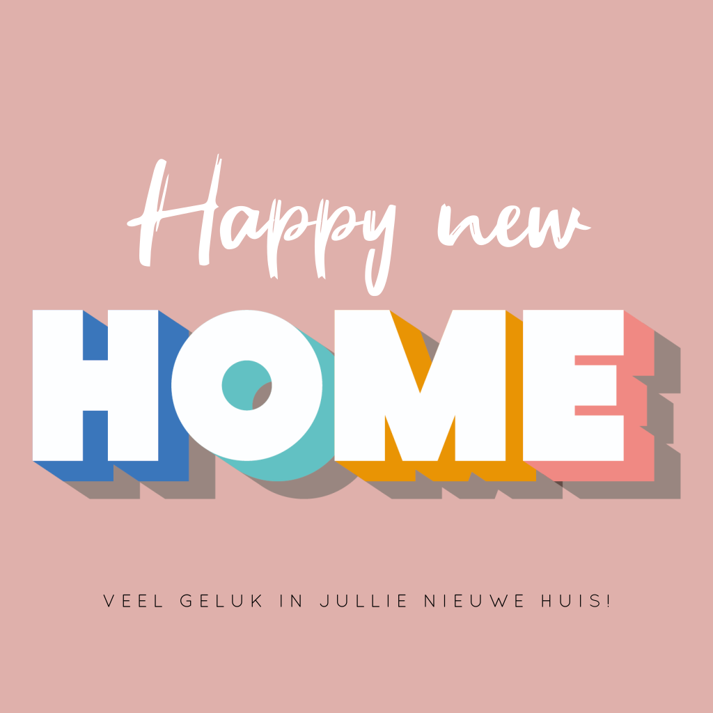 Felicitatie voor een nieuw adres met kleurrijke letters en de tekst "Happy new home". Voeg je persoonlijke felicitatie toe op de binnenzijde van deze verhuis wenskaart.