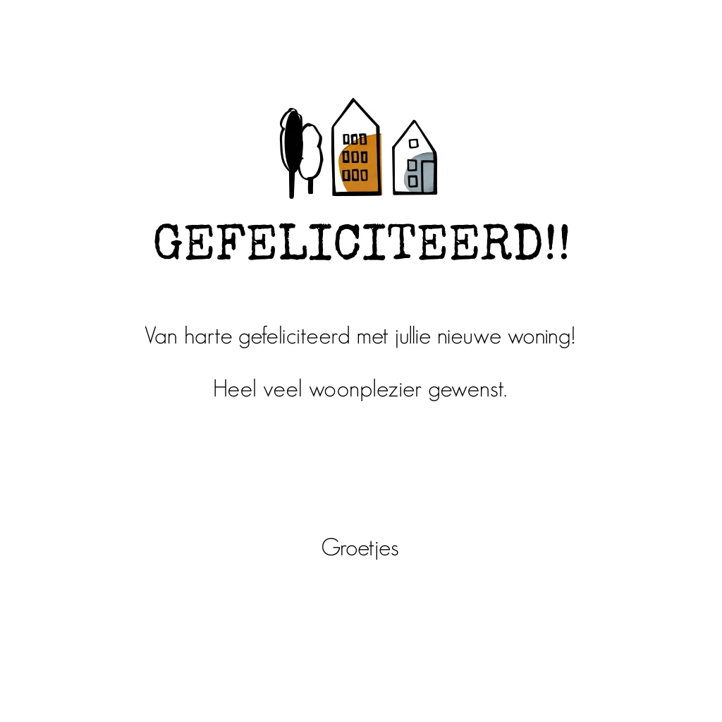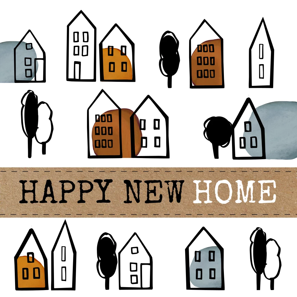 Happy new home! Leuke felicitatiekaart voor een nieuw huis of samenwonen met geïllustreerde huisjes en bomen.