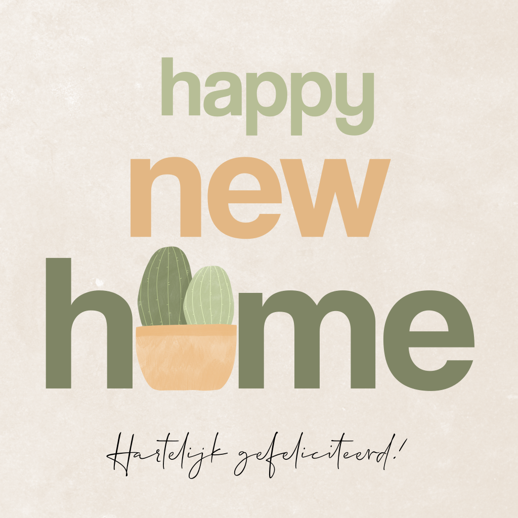 Felicitatiekaart voor een nieuw adres met een cactus en de tekst Happy new home.
