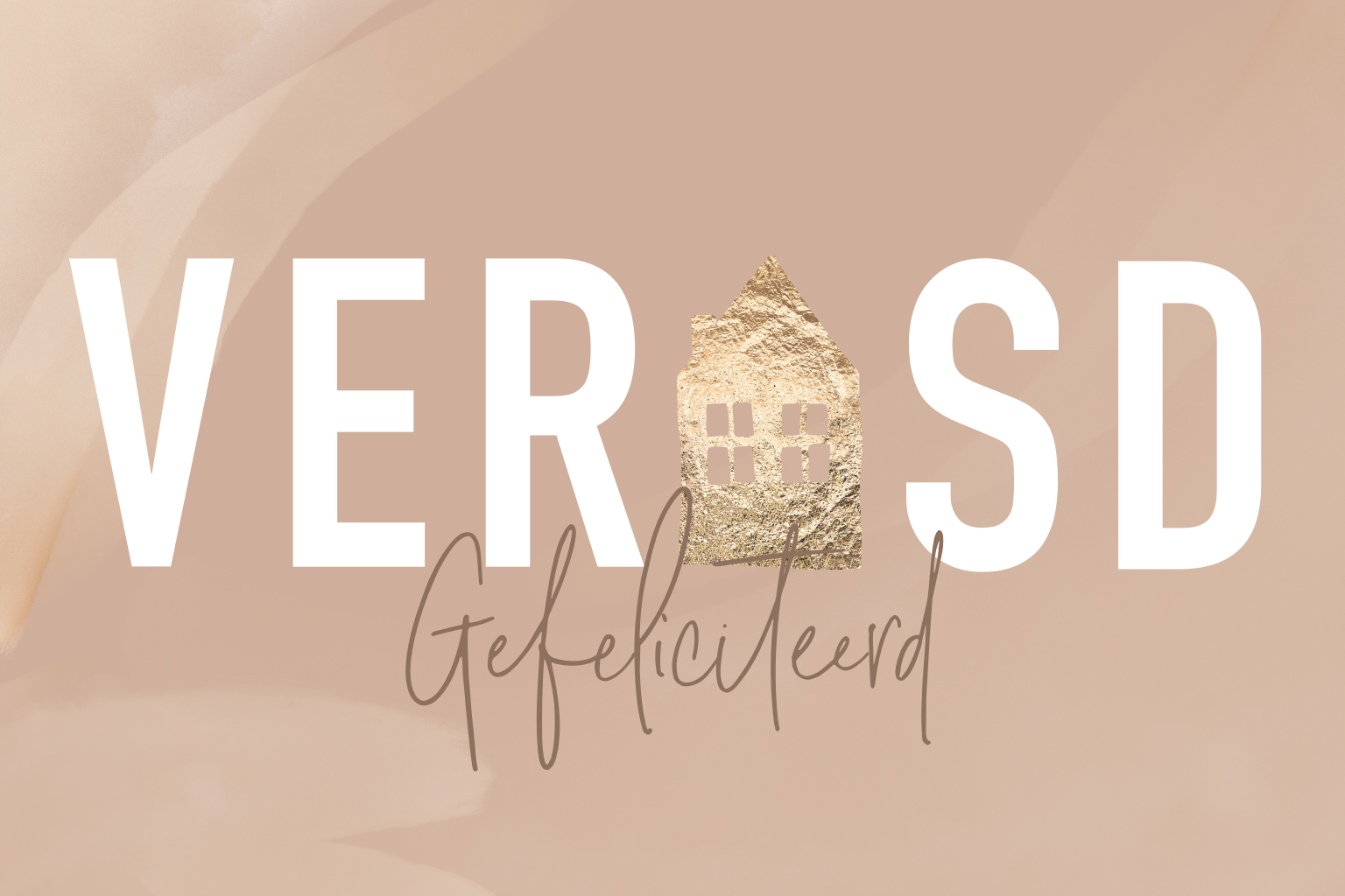 Modern felicitatiekaartje in trendy kleuren voor iemand die gaat verhuizen of samenwonen. Op de achtergrond een aquarel veeg en in de tekst is een goudkleurig huisje verwerkt.