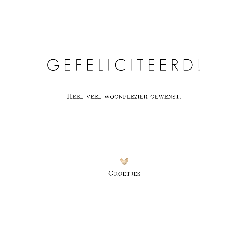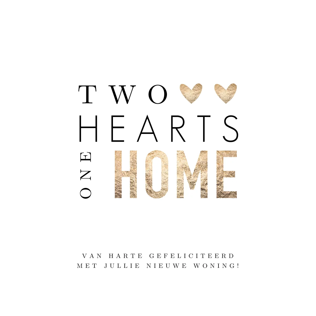 Hippe felicitatiekaart voor een nieuwe woning met de tekst " Two hearts, one home" in zwart-wit met goudlook.