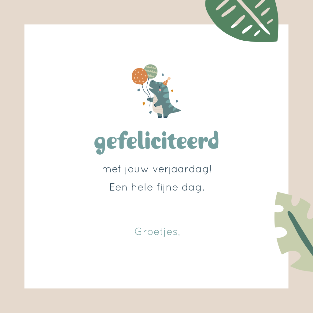 Vrolijke dino verjaardagskaart met aanpasbare leeftijd. Op deze vrolijke felicitatiekaart een dinosaurus met ballon, cupcake, confetti en botanische bladeren. Helemaal geschikt voor een kindje dat gek is van dino's! Pas de leeftijd gemakkelijk aan in de editor.