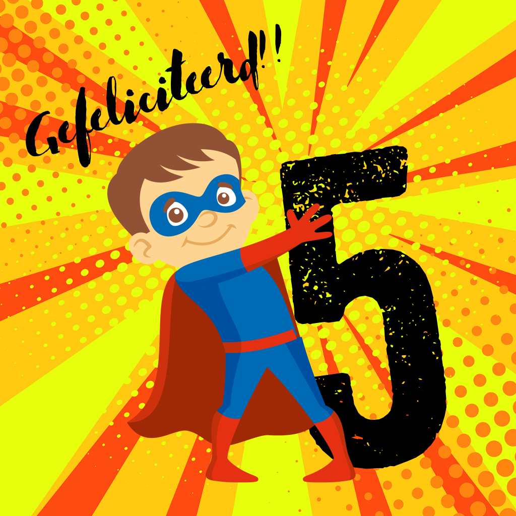 Vrolijke verjaardagskaart voor een kind met een leuke illustratie van een superheld die een cijfer vasthoudt. Dit getal is aanpasbaar naar de leeftijd van de jarige Job. Zo kun je deze felicitatie kaart ook gebruiken voor andere leeftijden.