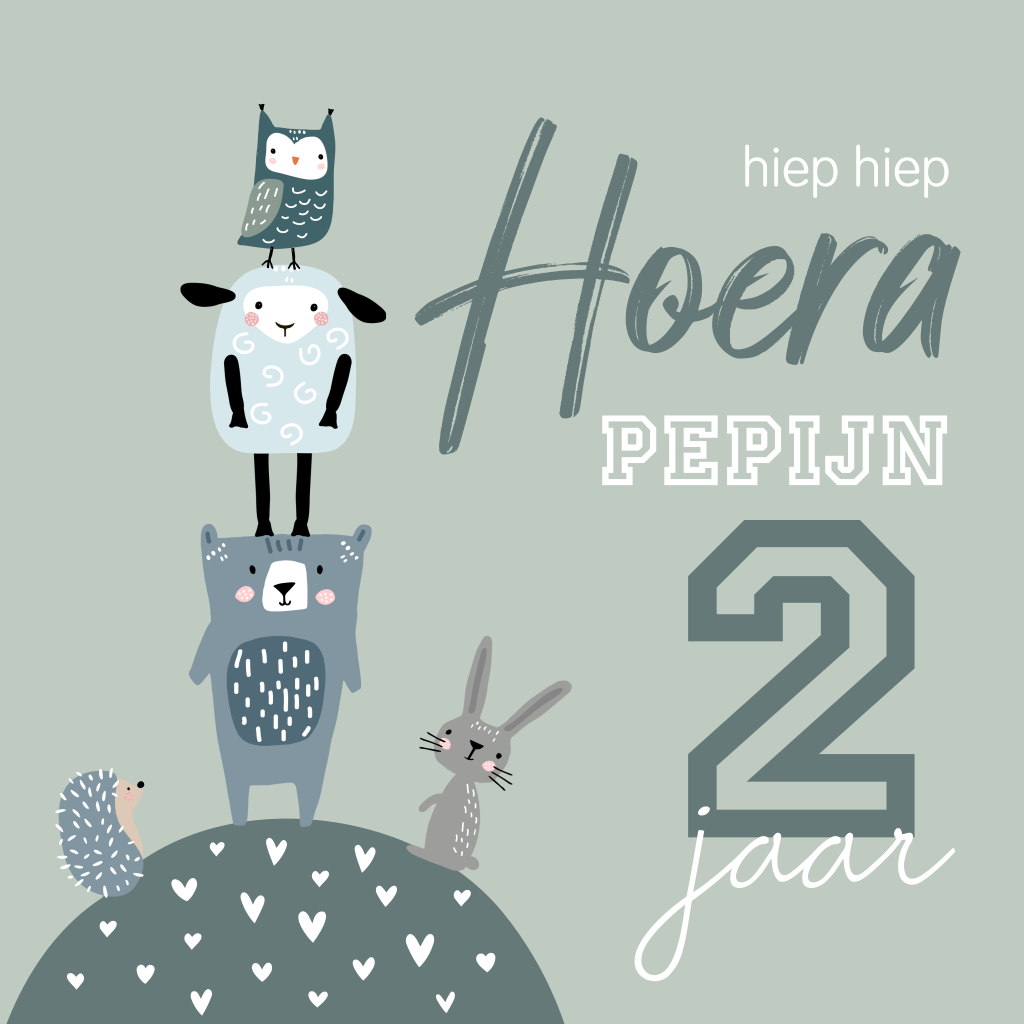 Hippe felicitatiekaart met dieren voor een jongen. Op dit wenskaartje voor een jarige Job staan diverse dieren, ook gestapeld op elkaar, wat een leuk effect geeft.