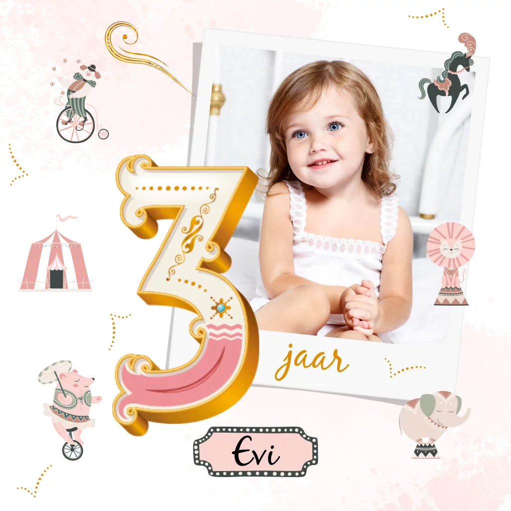 Vrolijke verjaardagskaart voor een meisje die 3 jaar wordt. Op dit felicitatie kaartje in circus thema, staat een circustent, een clown en verschillende dieren. Voeg een leuke foto toe van de jarige en pas de naam op de voorzijde aan.