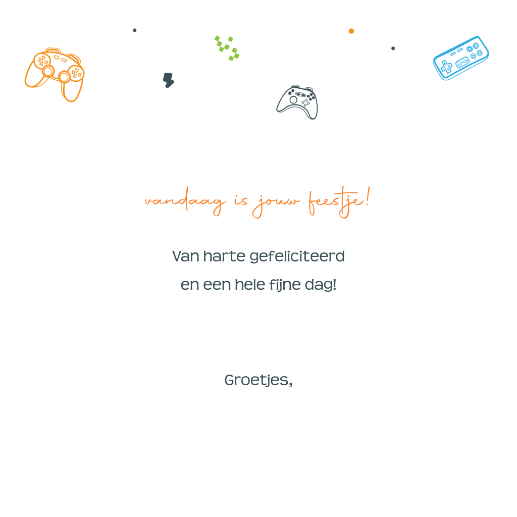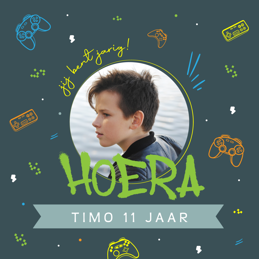 Stoere felicitatie kaart voor een jongen met verschillende game controllers en vrolijke kleuren. Vervang de foto voor een leuke foto van de jarige en voeg de naam en leeftijd toe. Zo verstuur jij een super persoonlijk kaartje!